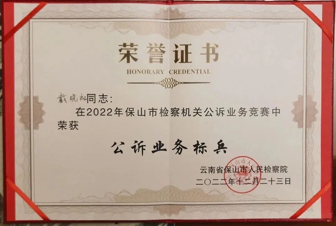 坚持人才兴检,激发队伍活力。严把干警招录选调标准,把好检察队伍的“入口关”,注重培养干警终身学习理念,鼓励干警在职提升学习。共招录选调全日制法学研究生4人,在职政读研究生学历4人,占队伍总人数的15.1%。多形式、多渠道培养锻炼干警,为干警搭建成长成才的舞台和平台,组织开展演讲比赛、知识竞赛、“检察人讲检察故事”系列活动,充分发掘干警潜能,让干警敢于走上舞台、充分展示自己。组织干警参与全市、全省公诉人大赛、“红土地之歌”演讲大赛、微党课比赛,锻炼提升干警综合素能。1名干警在保山市公诉人业务竞赛中获评“业务标兵”。1名干警荣获“红土地之歌”演讲大赛优秀奖和“学习贯彻落实党的二十大精神 建功新时代”主题微党课比赛“三等奖”。注重典型示范引领。充分挖掘立足岗位默默奉献、担当尽责、工作实绩突出的先进典型,发挥先进典型的示范引领作用,带动全体干警积极进取、担当作为。2022年以来,先后推出保山市“最美家庭”、保山市教育高质量发展“先进个人”、民族团结进步模范个人等一批先进个人,“腾.爱”未检办案团队被腾冲市委评为“青年文明号”。院集体被表彰为腾冲市民族团结进步模范集体,保山市模范机关、保山市平安单位。