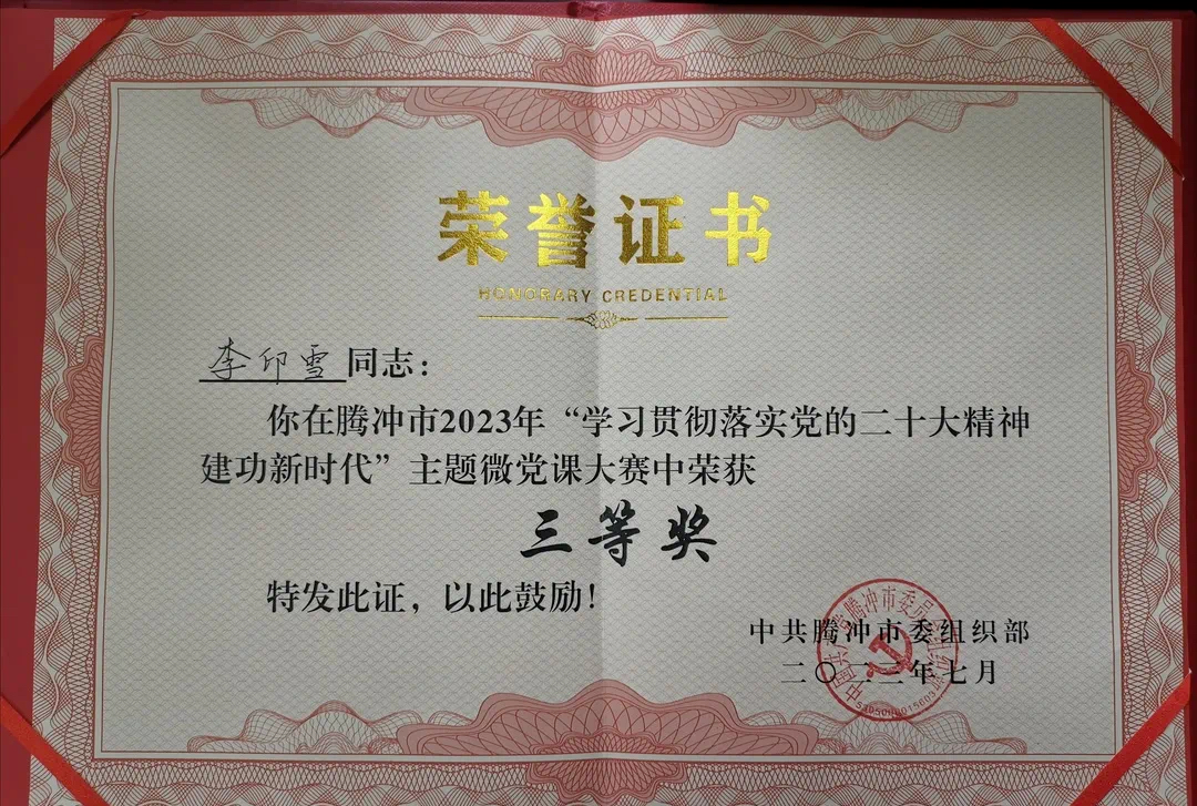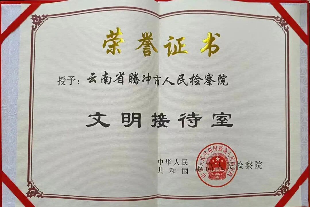 近年来,腾冲市检察院牢牢把握队伍建设的基础性战略性地位,把抓好检察队伍建设做为“头等要事”,以“政治建检、业务立检、作风强检、文化育检、人才兴检”为抓手,着力打造能力素质过硬、纪律作风严明、堪当时代重任的检察铁军,队伍中涌现出“云南省最美检察人物”“全省政法工作先进个人”“检察之星”等一批先进典型,张兆赛、李清分别被评为2021年度、2022年度“云南省十大法治新闻人物”,榜样力量推动检察工作取得了突出成效。控申部门连续六届18年获评全国检察机关“文明接待室”,被授予“全国巾帼文明岗”。荣获“第七次全国维护妇女儿童权益先进集体”“云南省检察机关扫黑除恶专项斗争优秀集体”,连续五届被评为云南省文明单位。基层党建连续多年考核均为“优秀”,院党支部被评为保山市“基层党建示范点”。